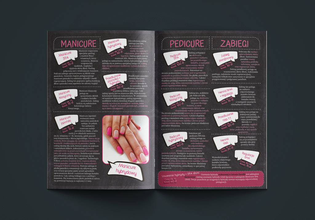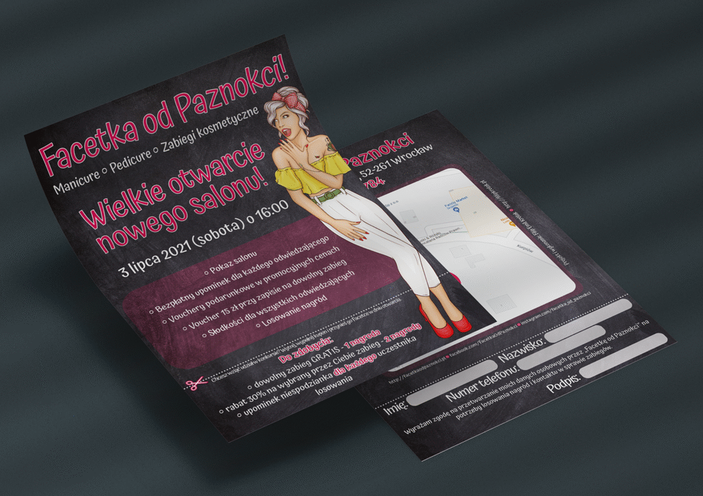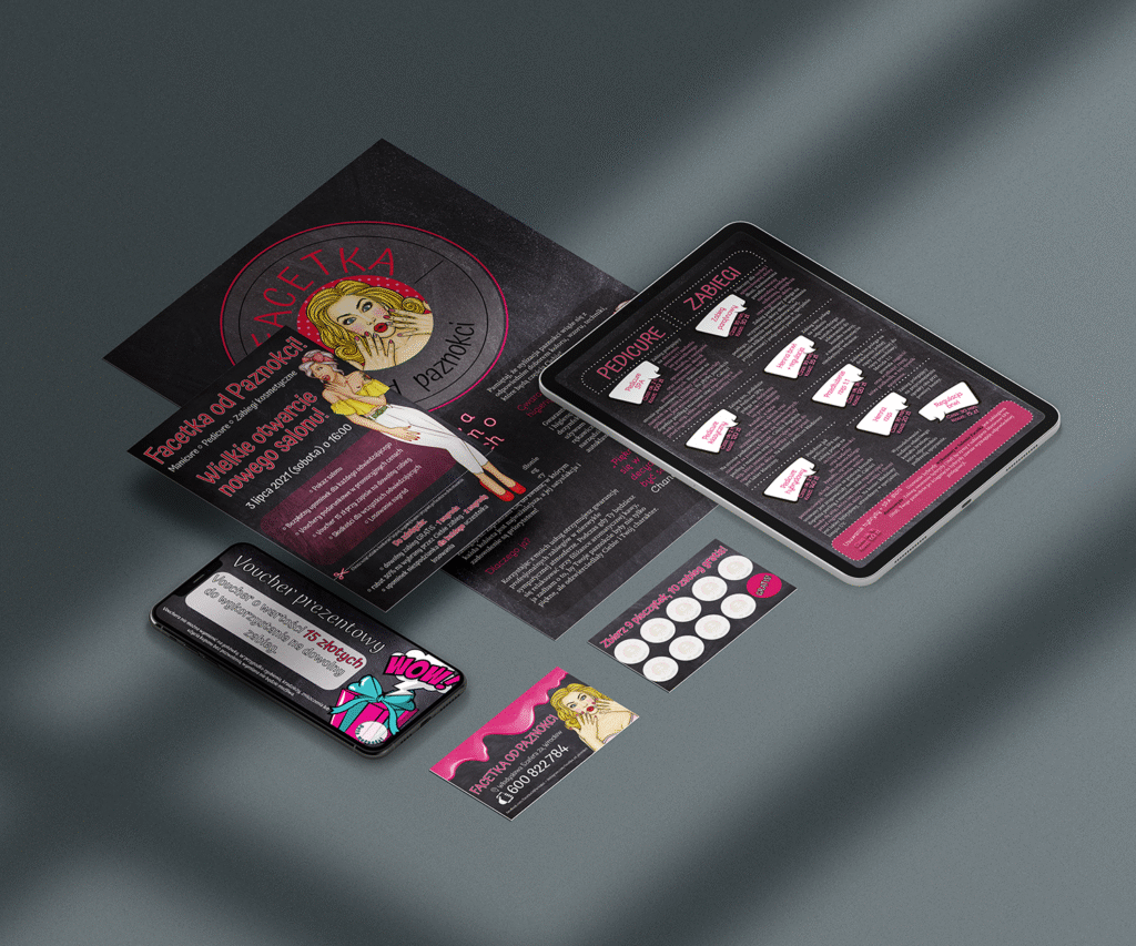 Duża swoboda w działaniu – coś co bardzo lubię choć nie ukrywam, że jakiś punkt zaczepienia dobrze mieć. Szczególnie jeśli tworzy się cały pakiet przeznaczony na specjalną okazję. Takim właśnie wydarzeniem było otwarcie (a właściwie zmiana miejsca) salonu manicure i pedicure – Facetka od Paznokci. Z tej właśnie okazji zostałem poproszony o przygotowanie kilku niezbędnych materiałów promocyjnych. Wśród nich znalazły się: ulotka z kuponem konkursowym, nowa wizytówka, która jest również kartą lojalnościową, broszura z opisem zabiegów wykonywanych w salonie oraz voucher prezentowy.