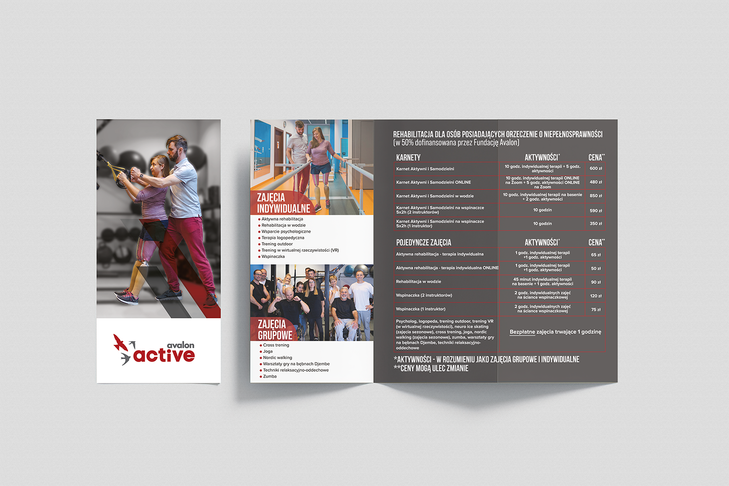 Od jakiegoś czasu pracowałem nad ulotką promującą projekt Avalon Active, który skupia się na rehabilitacji funkcjonalnej osób z problemami neurologicznymi oraz niepełnosprawnością narządu ruchu. Centrum Aktywnej Rehabilitacji Avalon Active oferuje sporo zróżnicowanych zajęć, zarówno indywidualnych jak i grupowych. Jakie to zajęcia oraz jak przedstawiają się cenowo, możecie zobaczyć na wizualizacji poniżej.